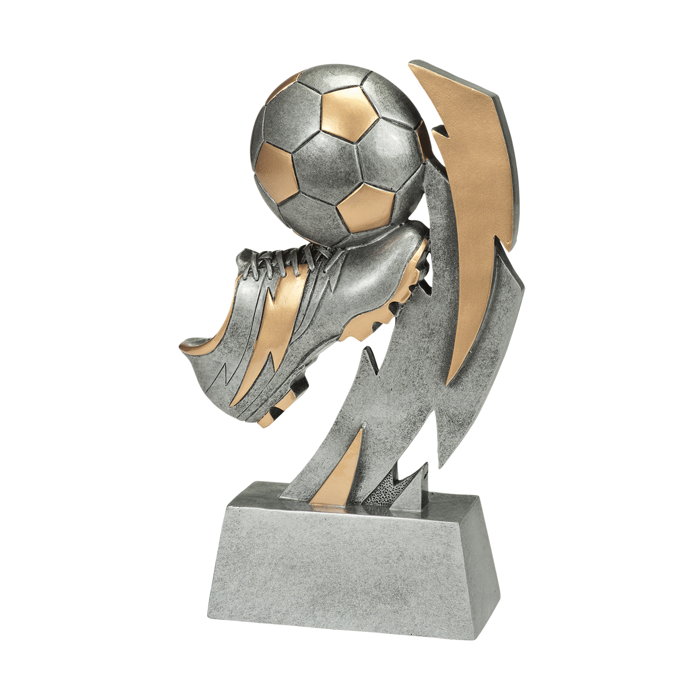 This silver trophy with golden details is suitable for any football tournament or event. Budgettrophy has the trophy readily available from stock in 5 different sizes. The trophy shows a football boot with a football ball. On the base of the trophy, you can have an engraving plate added with your own text. Budgettrophy will mount the engraving plate for you for free!
