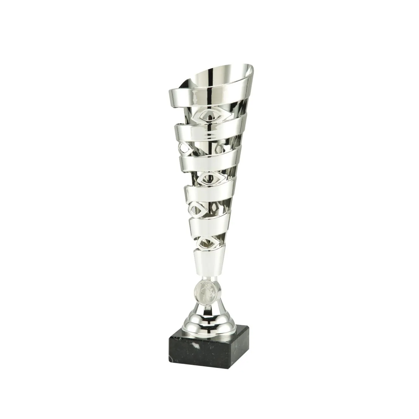 Ce beau trophée argenté est disponible en trois tailles différentes. Le trophée possède des détails ajourés, ce qui lui donne un rayonnement luxueux. De style classique, il convient à tous les événements. Ajoutez-y une plaquette portant un texte personnel afin de lui donner une dimension personnelle supplémentaire. Celle-ci sera apposée par Budgettrophy.