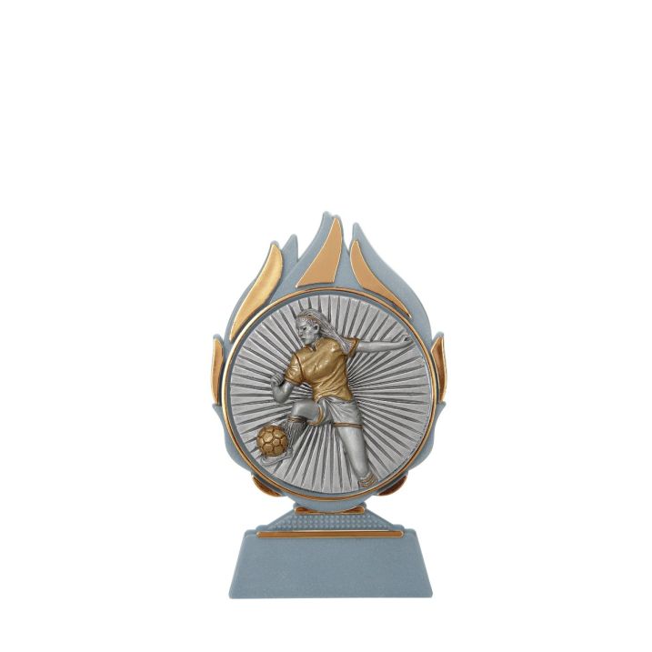 Budgettrophy has this trophy in stock in 3 different colours. The trophy is grey with golden details with a football disc on it. At the bottom of the trophy there is space for a text plate with your own text. Budgettrophy mounts the text plate free of charge for you !