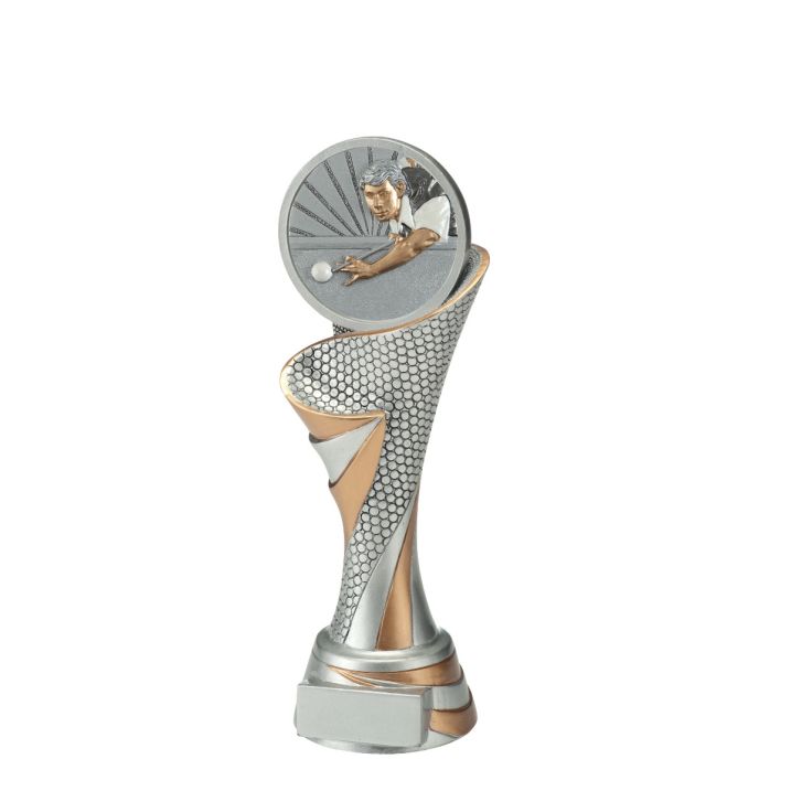 This beautiful, standing trophy is available in 3 different sizes. It is a silver trophy with golden details and a beautiful billiard disc is attached at the top. At the bottom of the trophy there is space for a text plate with your own text. Budgettrophy mounts this text plate free of charge for you!