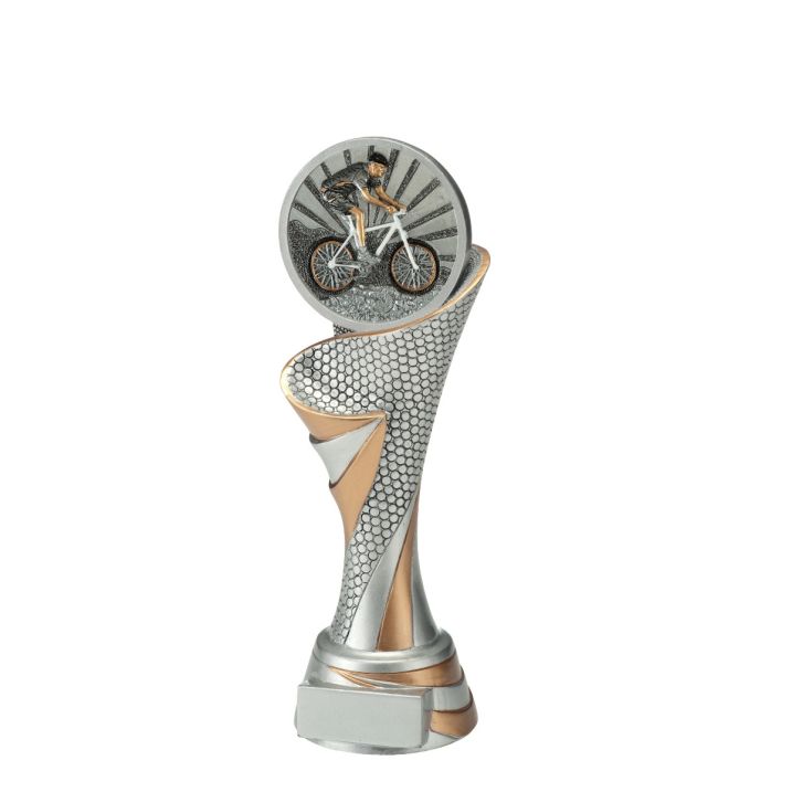This beautiful, standing trophy is available in 3 different sizes. It is a silver trophy with golden details and a beautiful mountainbiking disc is attached at the top. At the bottom of the trophy there is space for a text plate with your own text. Budgettrophy mounts this text plate free of charge for you!