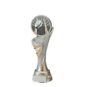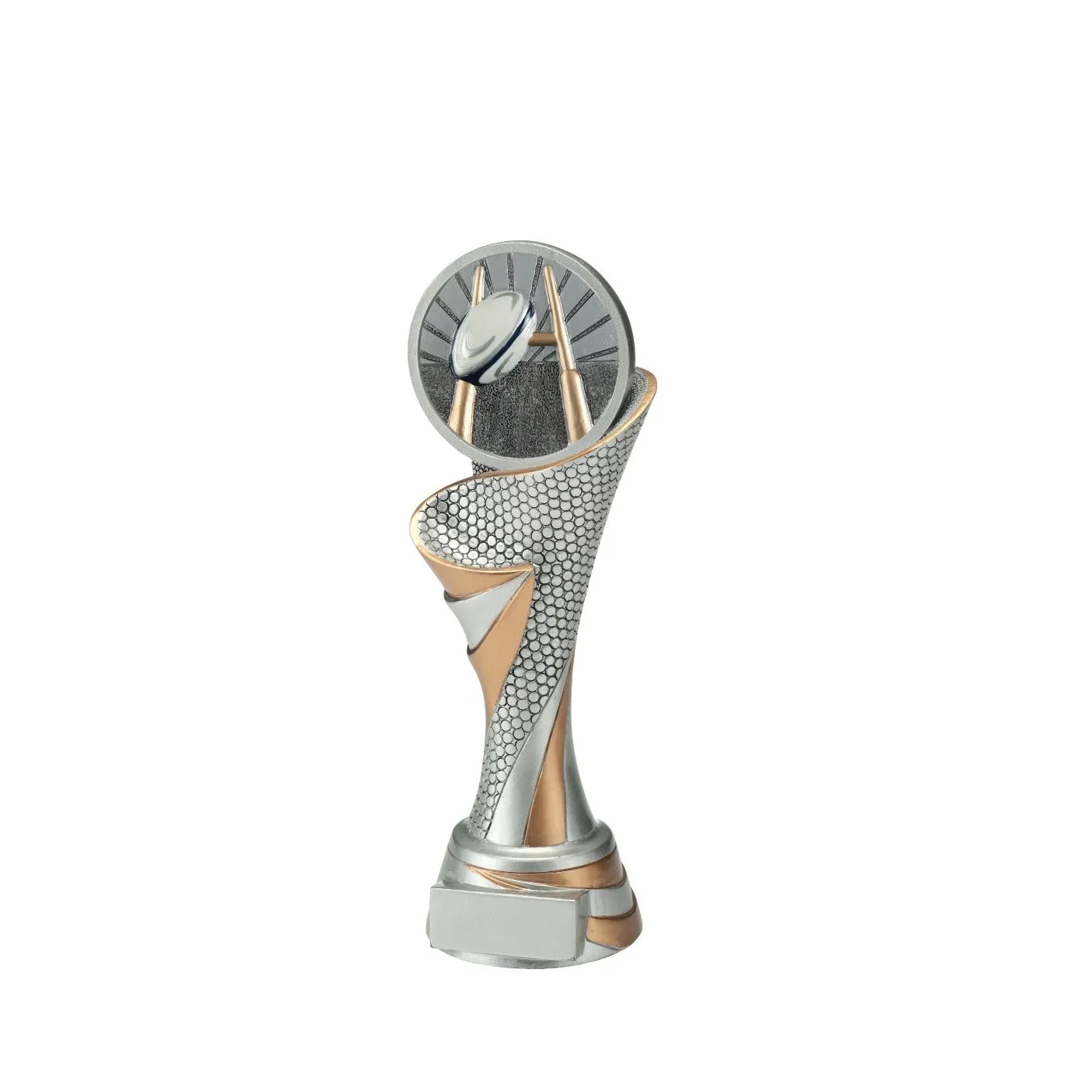 This beautiful, standing trophy is available in 3 different sizes. It is a silver trophy with golden details and a beautiful rugby disc is attached at the top. At the bottom of the trophy there is space for a text plate with your own text. Budgettrophy mounts this text plate free of charge for you!