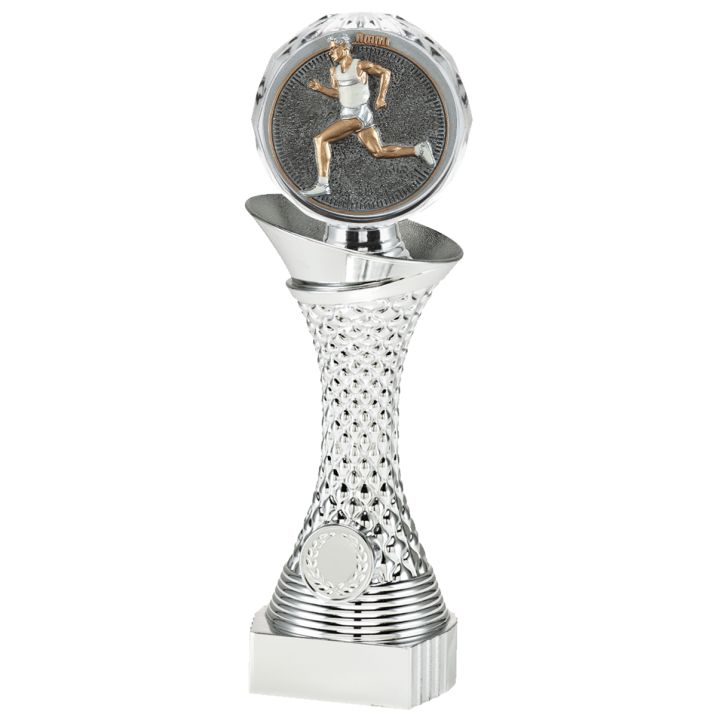 This silver trophy is available in 3 sizes at Budgettrophy. There is a beautiful running disc on the top of the trophy, and at the bottom there is space for your own image as well as a text plate! For the image, you can upload your own design. Or choose one of our images. Budgettrophy mounts the trophy free of charge for you.