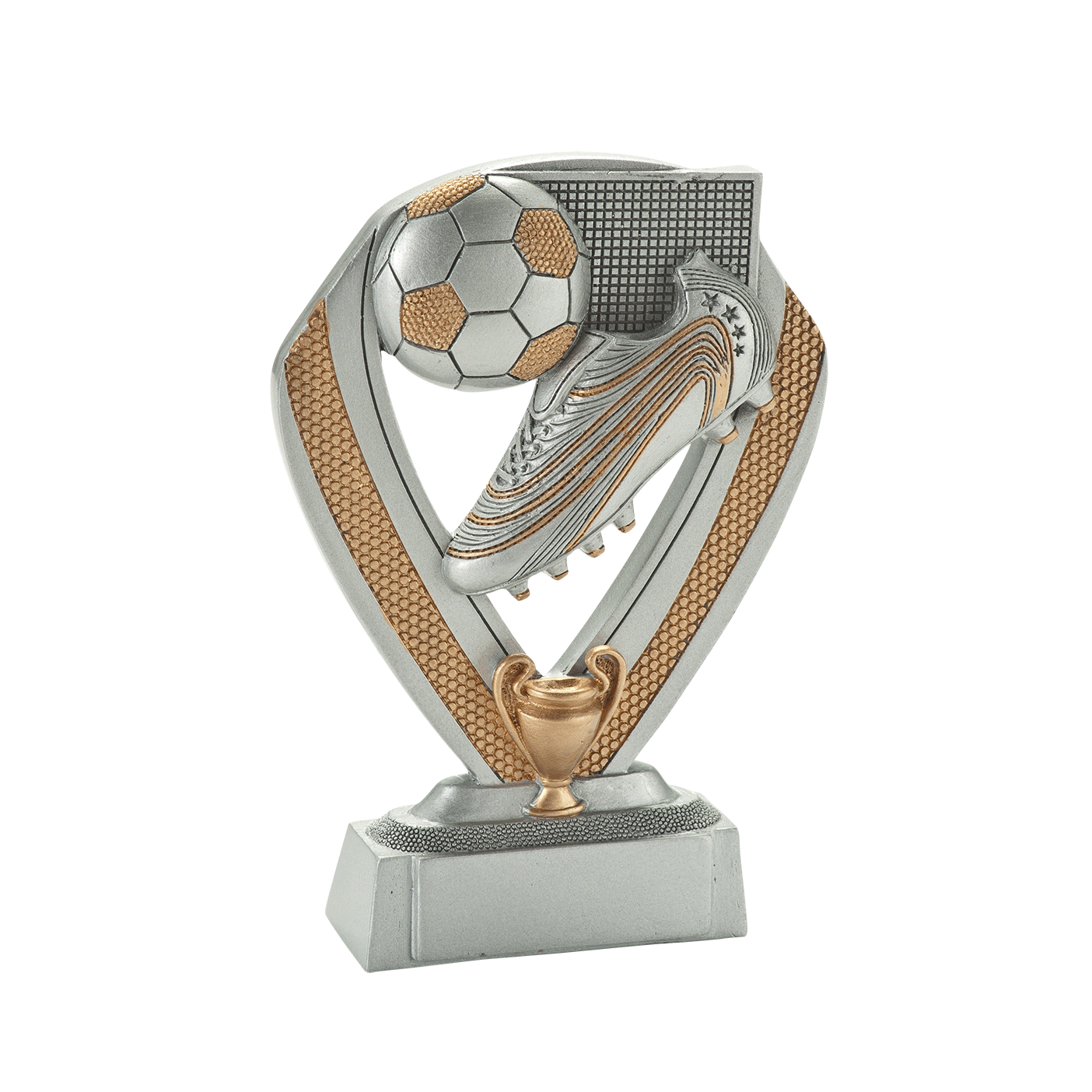 Budgettrophy has this football trophy readily available from stock in 3 different sizes. The trophy shows a football boot, with golden details, kicking against a football. On the base of the trophy, you can have an engraving plate added with your own text. Budgettrophy will mount the engraving plate for you for free!