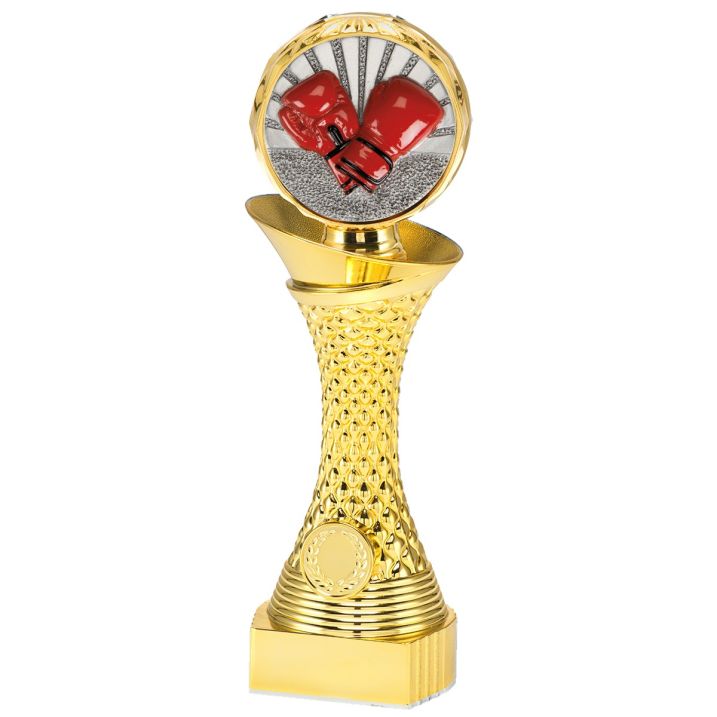 This golden trophy is available in 3 sizes at Budgettrophy. There is a beautiful boxing disc on top of the trophy, and at the bottom there is space for your own picture as well as a text plate! For the picture, you can upload your own design. Or choose one of our pictures. Budgettrophy mounts the trophy free of charge for you.