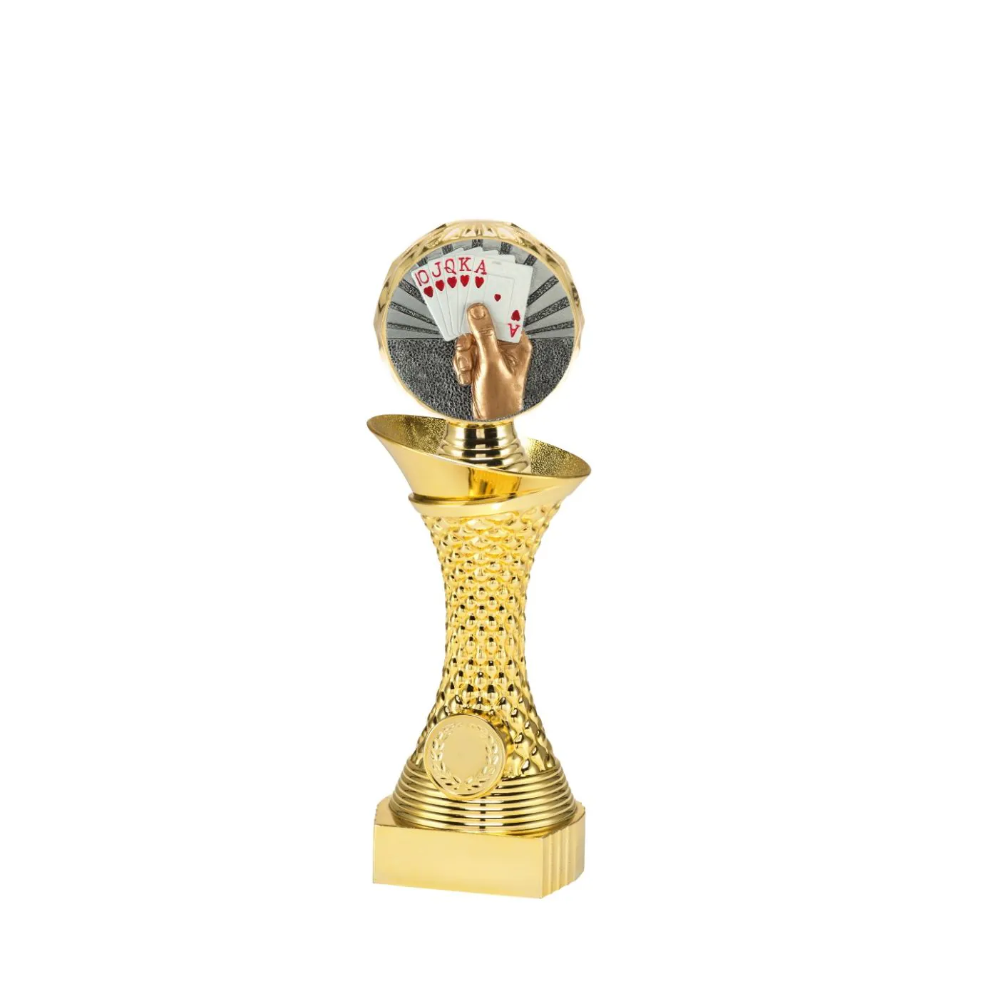 This golden trophy is available in 3 sizes at Budgettrophy. There is a beautiful cards disc on top of the trophy, and at the bottom there is space for your own image as well as a text plate! For the image, you can upload your own design. Or choose one of our images. Budgettrophy mounts the trophy free of charge for you.