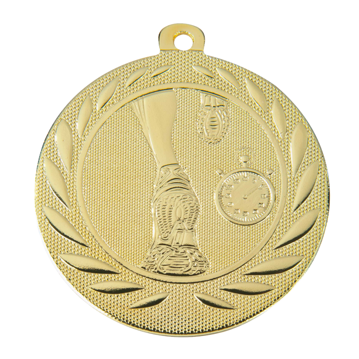 Tämän klassisen juoksumitalin halkaisija on 50 mm, ja siinä on kuva kahdesta juoksijasta. Budgettrophylta se on saatavilla kultaisena, hopeisena ja pronssisena. Voit valita haluamasi värisen nauhan laajasta nauhavalikoimastamme ja lisätä mitalin taakse oman tekstin. Budgettrophy asentaa tekstin ja nauhan ilmaiseksi!