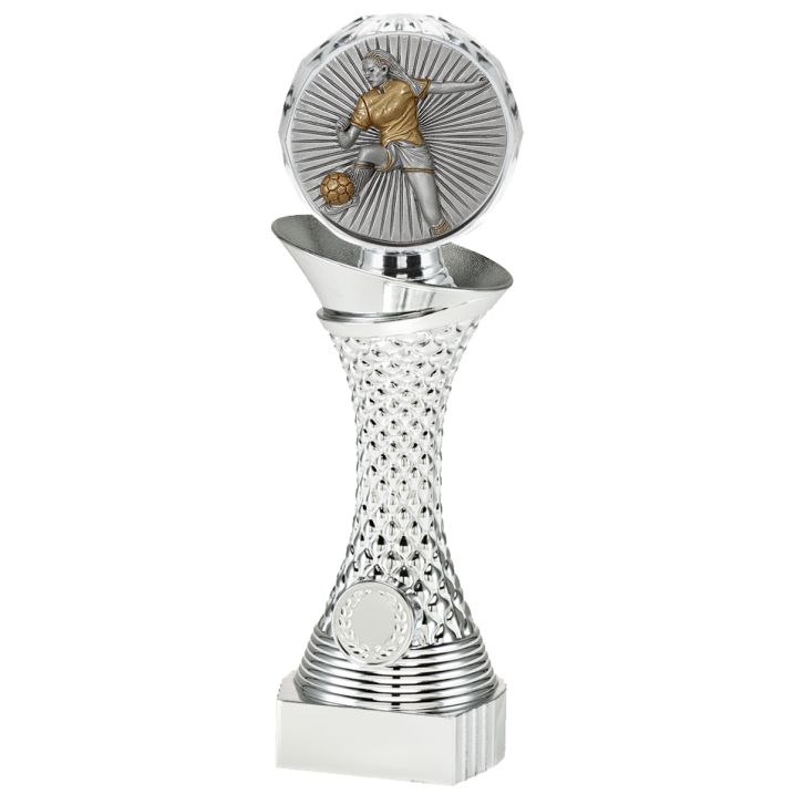 Tyylikäs hopeanvärinen naisten jalkapallopalkinto Lieke on saatavana kolmessa eri koossa. Palkinnon yläosaa koristaa vauhdikas jalkapalloilijan kuva, palkinnon alaosaan voidaan lisäksi liittää lajitunnus tai oma kuva-aiheesi. Hopeanvärinen tekstilaatta toivomallasi tekstillä viimeistelee palkinnon!