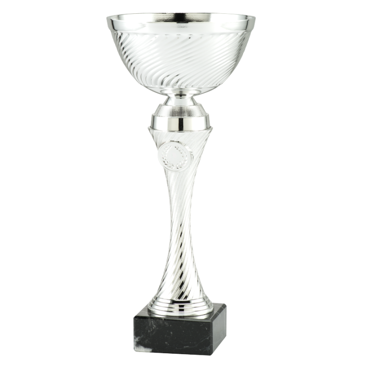 Tämä upeasti välkehtivä hopeanvärinen pokaali on saatavana viidessä eri koossa. Linjakkaasti muotoillun pokaalin varsiosaan voidaan halutessasi sijoittaa valitsemasi kuva Budgettophyn lajitunnusmallistosta, ja voit myös tietysti ladata oman logosi, jonka tulostamme varren yläosaan. Kiinnitämme hopeanvärisen tekstilaatan tilaamallasi tekstillä pokaalin mustaan marmorijalustaan.