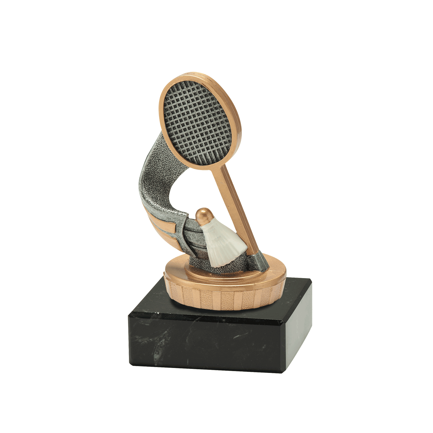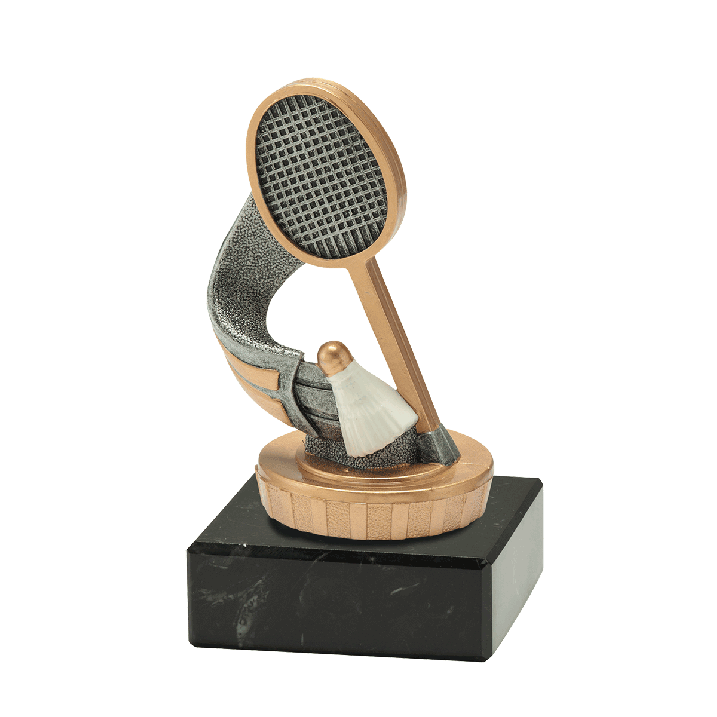 Ce trophée de badminton est disponible en stock chez Budgettrophy. Le trophée en argent antique, orné de détails dorés, convient à tous les tournois ou événements de badminton. Vous pouvez ajouter une plaque gravée de votre propre texte sur le pied de marbre. Budgettrophy vous offre le montage de la plaque gravée gratuitement !