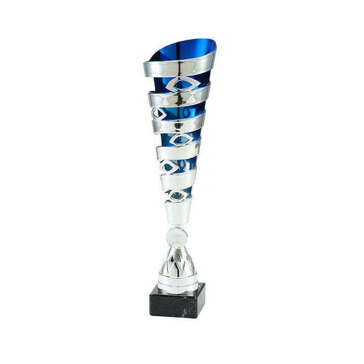 Ce trophée argent aux détails bleue donnera une dimension unique à votre événement. Personnalisez le trophée en plaçant sur le pied un texte qui correspond à votre événement. Choisissez également une des images (de sport) classiques ou créez une image personnelle, destinée au trophée. Budgettrophy se charge gratuitement du montage.