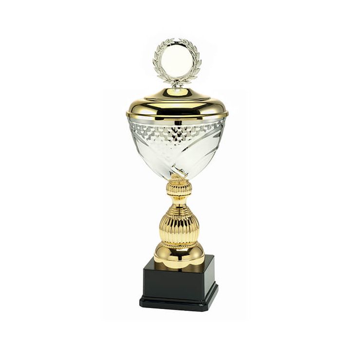 Cette coupe unique est disponible dans dix tailles différentes. L’association d’argenté et de doré lui donne un style luxueux. La coupe fermée apporte également une touche supplémentaire. Vous pouvez également apposer un logo/une illustration de votre choix sur le dessus de la coupe. Une plaquette portant un texte peut apporter une touche encore plus personnelle à ce trophée. Budgettrophy se charge d’apposer l’illustration et la plaquette de texte.