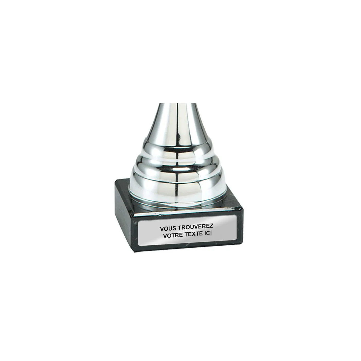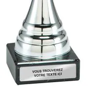Ce trophée prestige est disponible chez Budgettrophy en 3 tailles différentes en stock. Le trophée est argenté et monté dessus est un disque jeux de cartes. En bas du trophée il y a de la place pour une plaque gravée de votre propre texte. Budgettrophy vous offre le montage de la plaque gravée gratuitement!