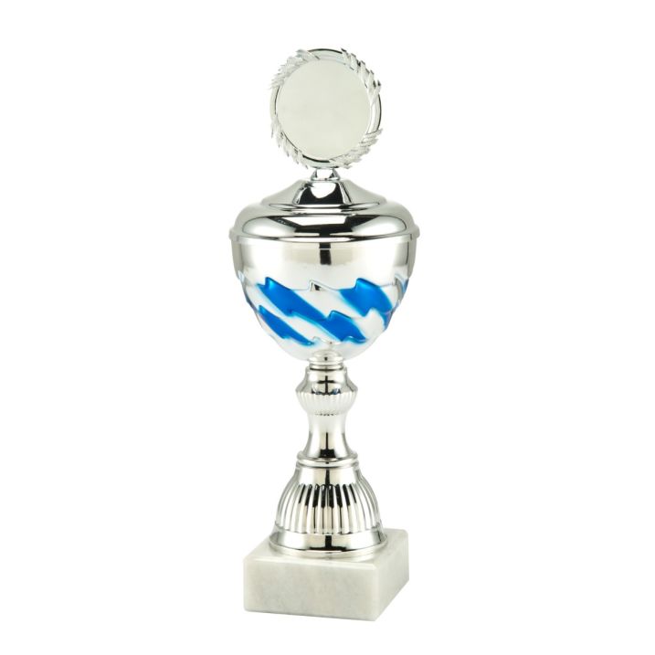 Ce trophée avec couvercle est disponible en 6 tailles chez Budgettrophy. De beaux détails bleus sont visibles sur la coupe. Une illustration peut être placée au sommet du couvercle. Vous pouvez pour cela sélectionner une illustration dans notre catalogue ou télécharger vous-même une illustration. Une plaque gravée avec un texte peut être placée sur le socle en marbre blanc.