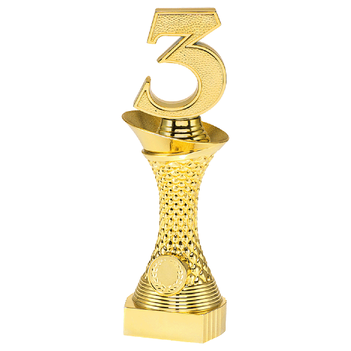 Ce trophée doré No.3 est disponible en stock chez Budgettrophy dans 3 tailles différentes. Tout le trophée est dorée, avec le numéro 3. Vous pouvez personnaliser votre trophée en ajoutant une pastille au centre en bas du trophée. Sur le pied vous pouvez également ajouter une plaque gravée avec votre propre texte. Budgettrophy vous offre l’assemblage de la pastille et de la plaque gravée gratuitement !