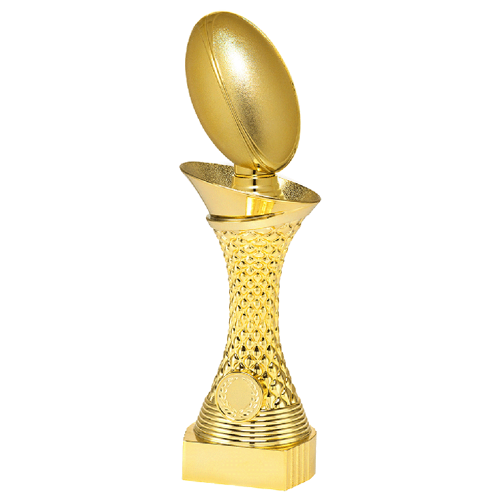 Ce trophée doré Rugby est disponible en stock chez Budgettrophy dans 3 tailles différentes. Tout le trophée est dorée, avec un ballon de rugby doré. Vous pouvez personnaliser votre trophée en ajoutant une pastille au centre en bas du trophée. Sur le pied vous pouvez également ajouter une plaque gravée avec votre propre texte. Budgettrophy vous offre l’assemblage de la pastille et de la plaque gravée gratuitement !