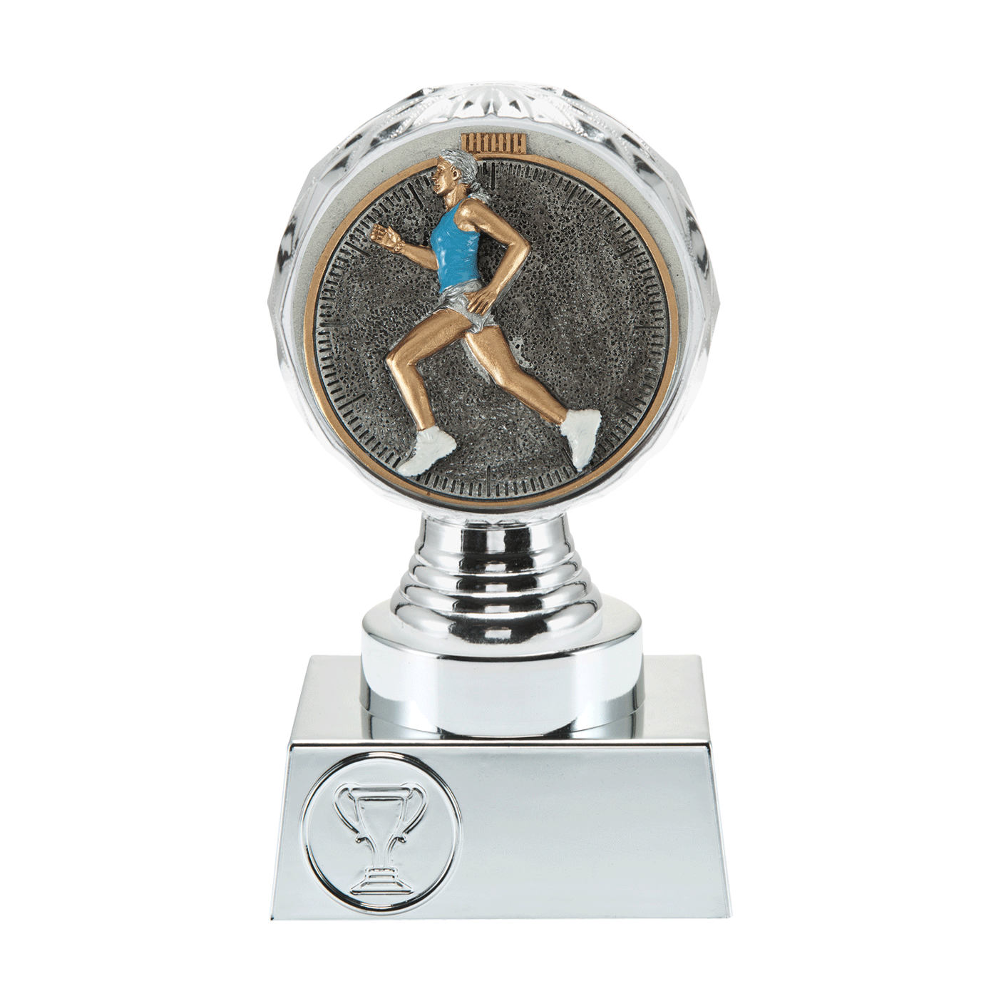 Ce trophée est disponible chez Budgettrophy en 3 tailles différentes en stock. Le trophée est argenté de couleur et monté dessus est un disque course à pied dames. En bas du trophée il y a de la place pour une image (sportive) et une plaque gravée de votre propre texte. Budgettrophy vous offre le montage de l’image (sportive) et de la plaque gravée gratuitement!