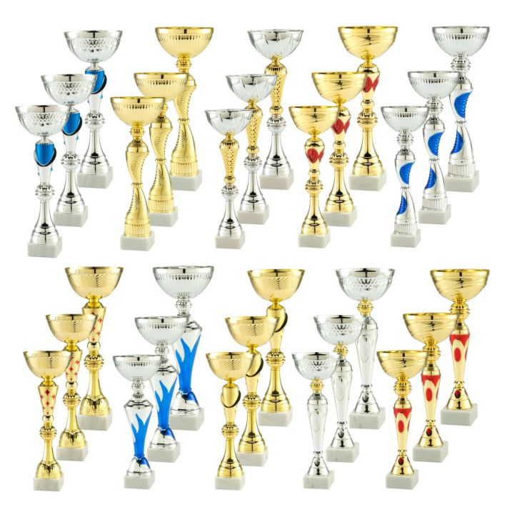 Avec la formule avantage de trophées Joan, une seule démarche suffit et vous êtes prêt pour la remise de prix. Avec pas moins de 30 trophées dans cette formule avantage, vous disposez de tous vos prix sportifs à un prix compétitif. Le paquet avantage se compose de 10 séries de trophées dans différents modèles, couleurs et formats. Idéal quand vous organisez une compétition pour des participants de différentes catégories et disciplines. Les trophées peuvent également être personnalisés avec un texte sur le pied du trophée. Vous souhaitez un texte différent par trophée ? Pas de problème ! Dans l’entrée de texte, vous pouvez indiquer par trophée quel texte correspond à chaque coupe. Vous indiquez par exemple « texte pour le plus petit trophée » avec le texte en-dessous. Si vous n’avez pas assez d’espace, nous pouvons vous envoyer une feuille Excel pour remplir simplement vos souhaits de personnalisation.