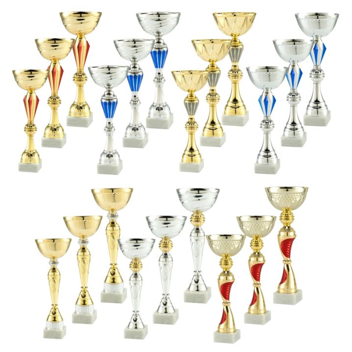 Vous voulez commander tous vos prix sportifs en une fois, rapidement et facilement ? La formule avantage de trophées Sean est pour vous. La formule avantage se compose de pas moins de 21 trophées qui peuvent tous être personnalisés. Une commande et vous êtes directement prêt pour la remise des prix. La formule avantage se compose de 7 séries de trophées de différents modèles, couleurs et formats. Idéale si vous organisez une compétition pour des participants de différentes catégories et disciplines. Placez un texte personnel sur le pied du trophée pour un prix sportif décidément unique. Vous voulez un texte différent par trophée ? Pas de problème ! Dans l’entrée de texte, vous pouvez indiquer par trophée quel texte correspond à chaque coupe. Vous indiquez par exemple « texte pour le plus petit trophée » avec le texte en-dessous. Si vous n’avez pas assez d’espace, nous pouvons vous envoyer une feuille Excel pour remplir simplement vos souhaits de personnalisation.