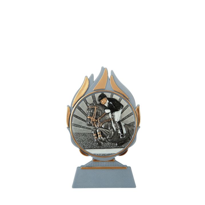 Ce trophée est disponible sur stock chez Budgettrophy en 3 couleurs différentes. Le trophée est gris avec des détails dorés sur lesquels se trouve un disque de équitation. Il y a de la place au bas du trophée pour apposer un texte personnel. Budgettrophy exécute gratuitement pour vous le montage de la plaque de texte !