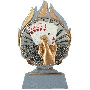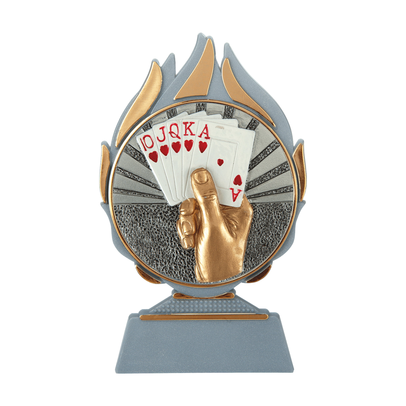 Ce trophée est disponible chez Budgettrophy en stock et en 3 couleurs différentes. Le trophée est gris avec des détails dorés, par dessus un disque jeux de cartes. Sur le bas du trophée il y a de la place pour une plaque gravée de votre propre texte. Budgettrophy effectue le montage de la plaque gravée gratuitement pour vous!