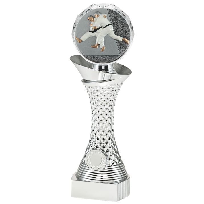 Ce trophée argenté peut être commandé en 3 tailles différentes chez Budgettrophy. Il est pourvu en haut d’un joli disque de judo et il y a de la place en bas pour apposer une propre illustration et une plaque avec un texte ! Vous pouvez pour cela télécharger votre propre illustration. Ou bien choisir une de nos illustrations. Le montage du trophée est gratuitement exécuté par Budgettrophy.