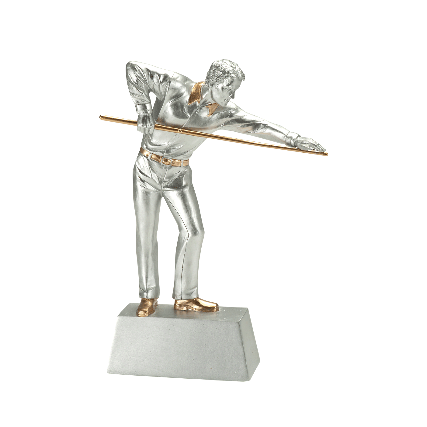 Ce trophée résine Billard argenté avec détails dorés est disponible en stock chez Budgettrophy, en 3 tailles différentes. Ce trophée montre un joueur de billard avec une queue dans sa main. Sur le pied du trophée vous pouvez ajouter une plaque gravée avec votre propre texte. Budgettrophy attache la plaque gravée gratuitement pour vous !
