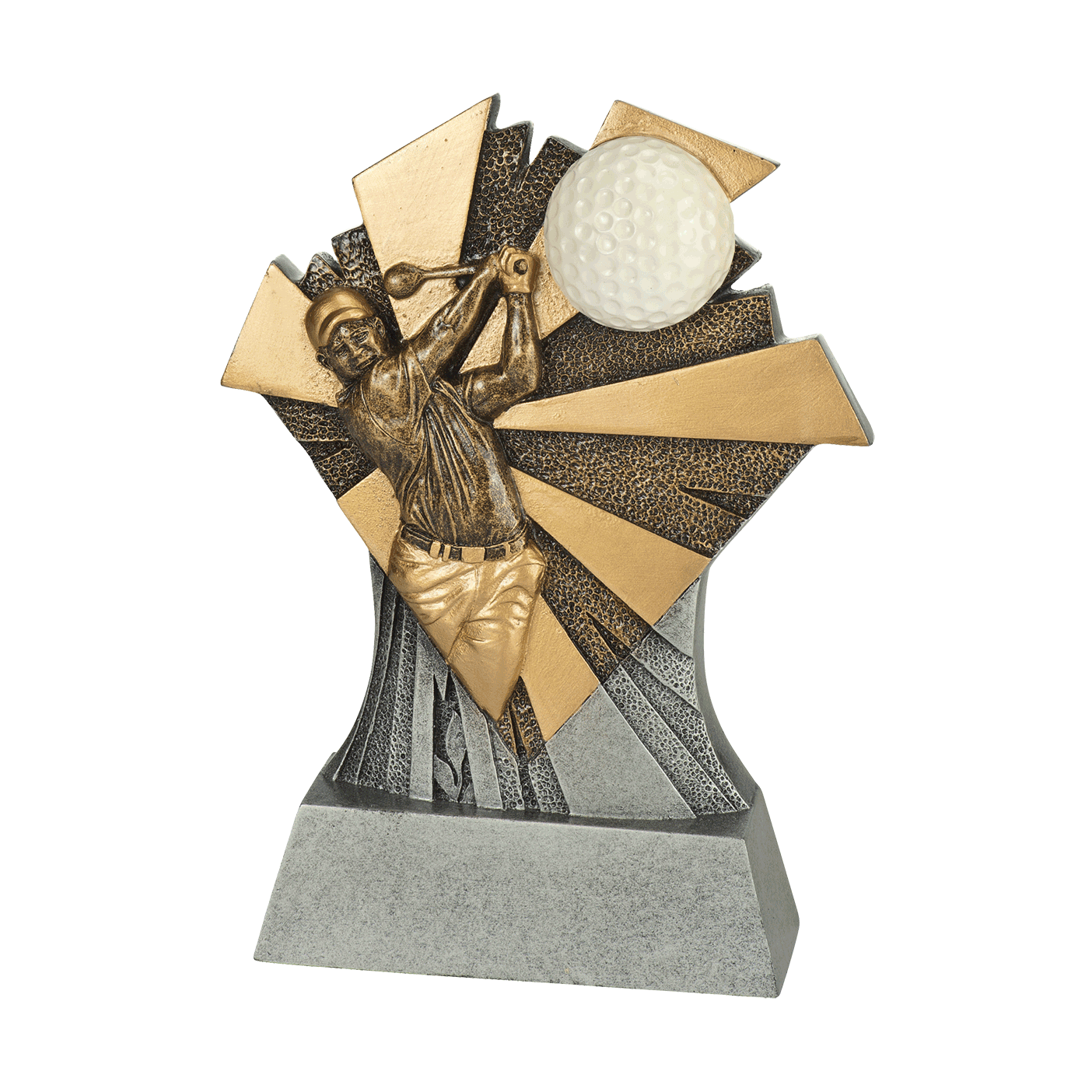 Ce trophée résine argentée avec des détails dorés, pour le golf est disponible en stock chez Budgettrophy. Le trophée montre un joueur de golf qui frappe une balle de golf. Sur le pied du trophée vous pouvez ajouter une plaque gravée avec votre propre texte. Budgettrophy attache la plaque gravée pour vous gratuitement !