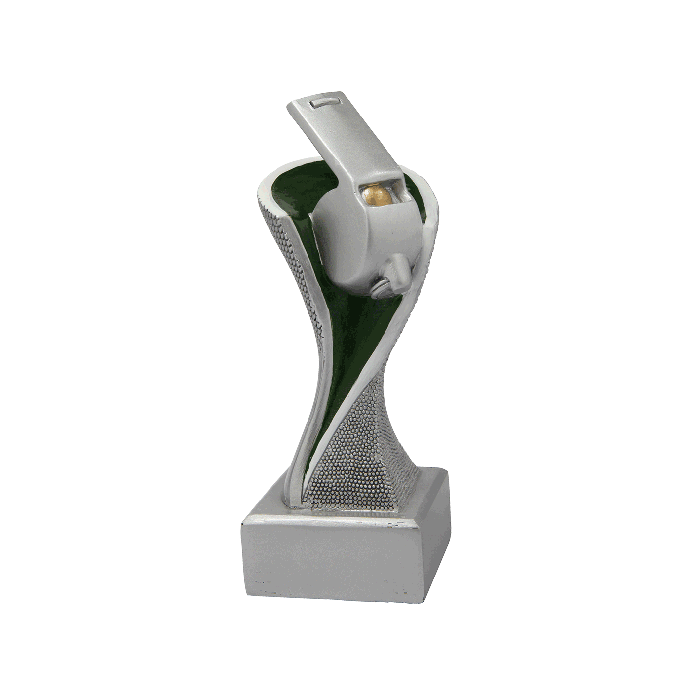 Ce trophée résine argentée mat avec des détails verts pour les arbitres est disponible en stock chez Budgettrophy. Le trophée montre un sifflet. Sur le pied du trophée vous pouvez ajouter une plaque gravée avec votre propre texte. Budgettrophy attache la plaque gravée pour vous gratuitement !