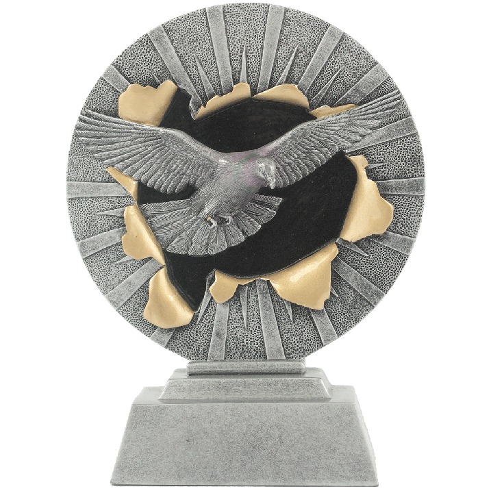 Ce trophée résine argenté, avec des détails dorés, pour la colombophilie, est disponible en stock chez Budgettrophy. Ce trophée montre un pigeon argenté avec des détails verts et violets. Sur le pied du trophée vous pouvez ajouter une plaque gravée avec votre propre texte. Budgettrophy attache la plaque gravée gratuitement pour vous !