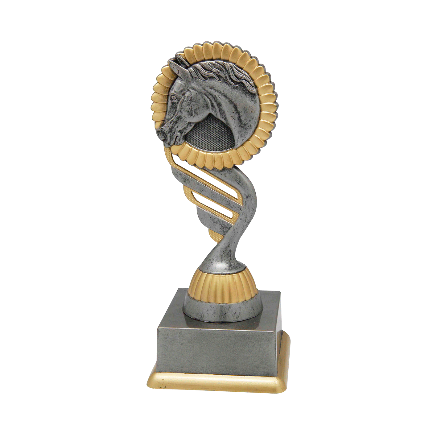 Ce trophée en argent antique avec des détails dorés est disponible en 3 tailles différentes (16 cm, 17,5 cm et 19 cm). Ce trophée montre une tête de cheval. Sur la base vous pouvez ajouter une plaque à gravure avec votre propre texte. Budgettrophy attache gratuitement la pastille et la plaque à gravure pour vous. Standard d’argent antique de sport équestres.