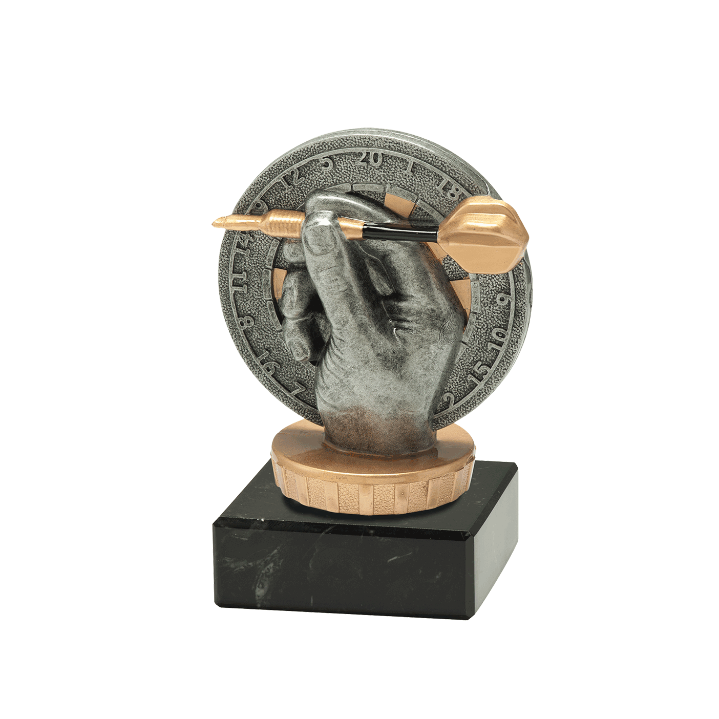 Ce trophée de fléchettes est disponible en stock chez Budgettrophy. Le trophée en argent antique, orné de détails dorés, convient à tous les tournois ou événements de fléchettes. Vous pouvez ajouter une plaque gravée de votre propre texte sur le pied de marbre. Budgettrophy vous offre le montage de la plaque gravée gratuitement !