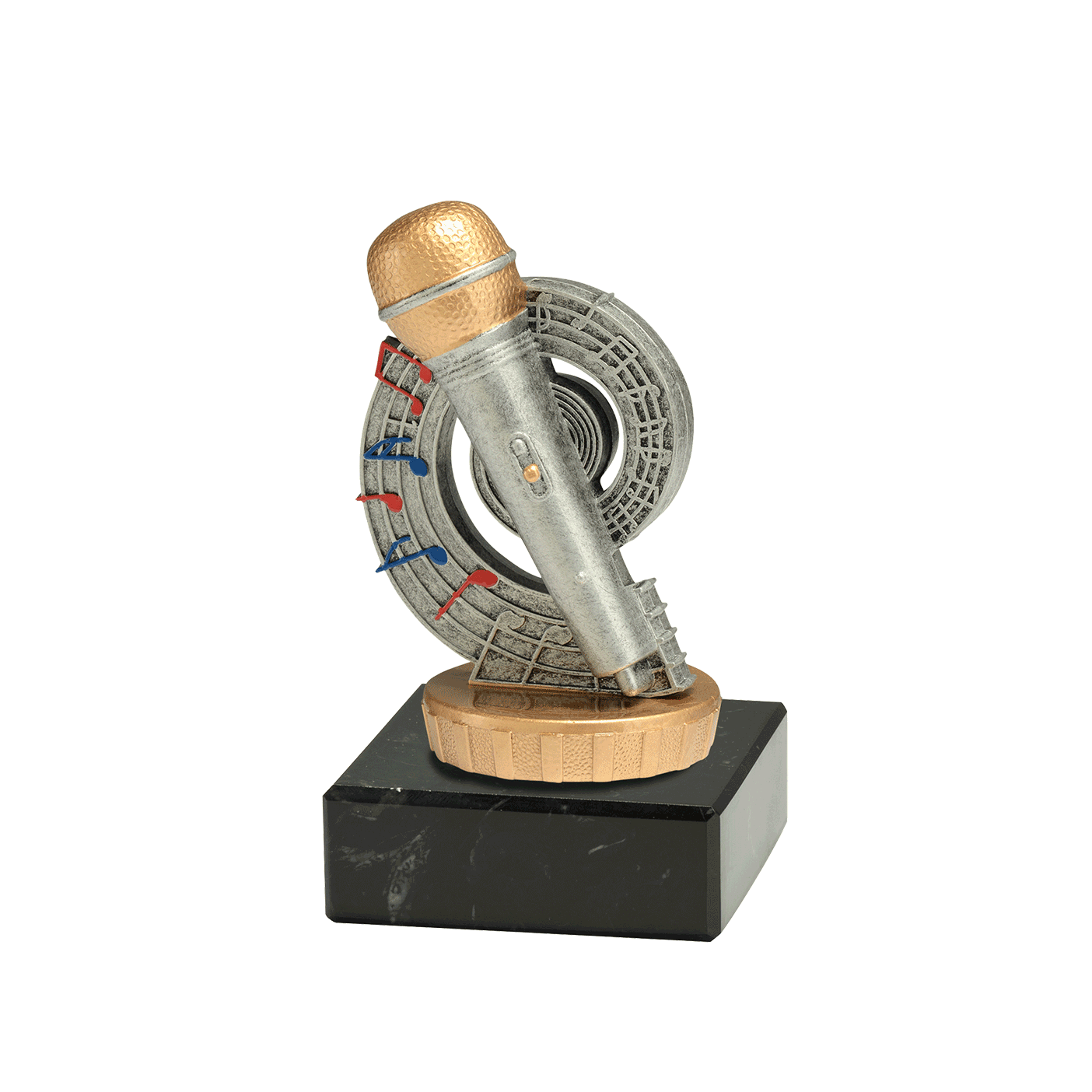 Ce trophée de karaoké est disponible sur stock chez Budgettrophy. Le trophée en argent antique,orné de détails dorés, convient à tous les concours de chant et de karaoké. Vous pouvez ajouter une plaque gravée de votre propre texte sur le pied de marbre. Budgettrophy vous offre le montage de la plaque gravée gratuitement !