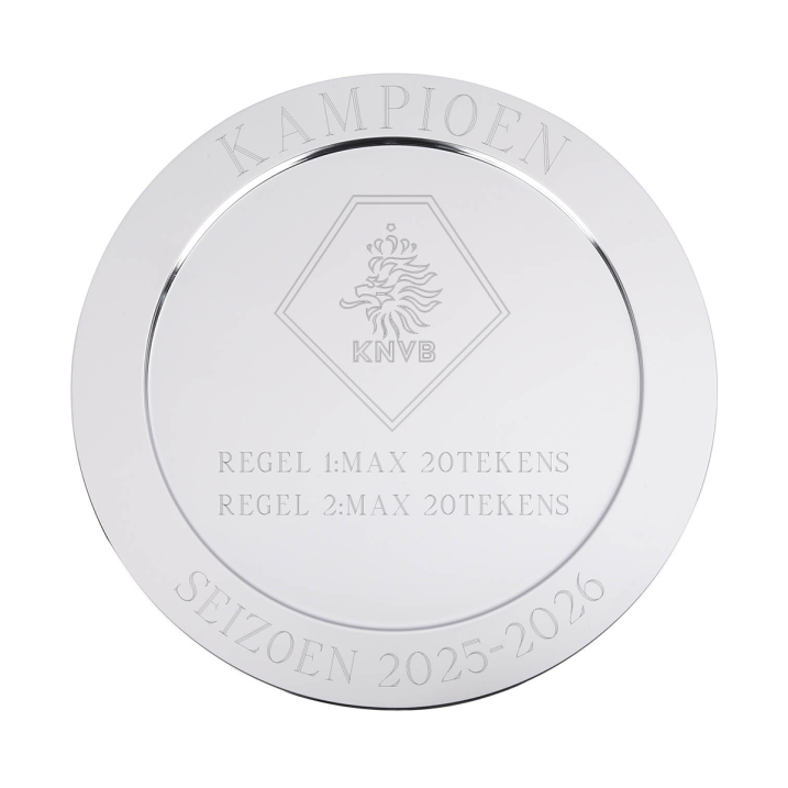Is jouw club onverwachts kampioen geworden, en wil je hier zo snel mogelijk een kampioensschaal voor in huis hebben? Kies dan voor deze voor gegraveerde kampioensschaal! Het KNVB logo en 'Seizoen 2025-2026' staan standaard in de schaal gegraveerd en je kunt hier zelf nog 2 regels tekst, met maximaal 20 tekens per regel aan toevoegen. Zo heb je binnen 2 werkdagen de kampioensschaal al in huis!