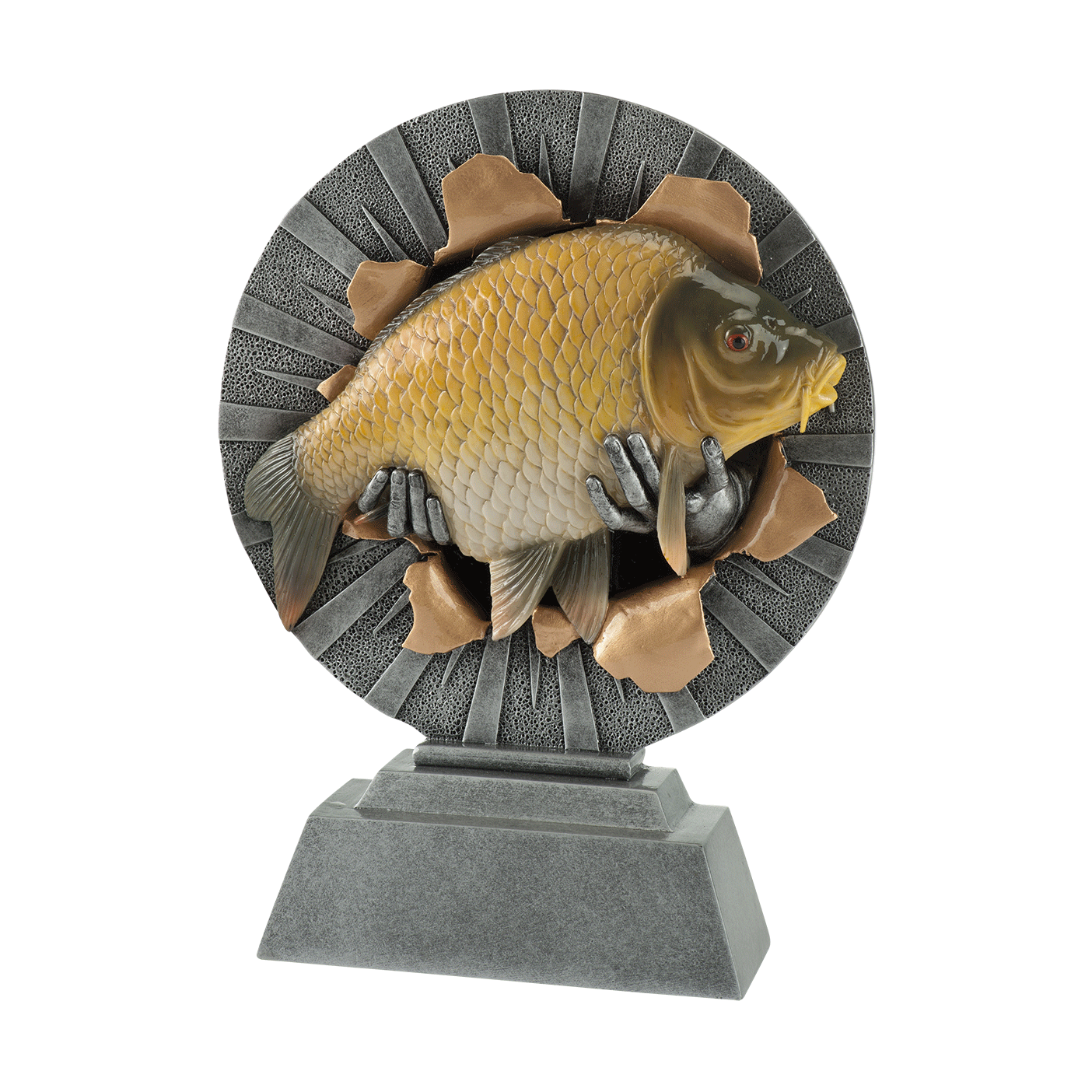 Deze mat zilveren resin met gouden details speciaal voor vissen heeft Budgettrophy direct beschikbaar uit voorraad. De trofee laat een vis zien die wordt vastgehouden door twee handen. Op de voet van de trofee kunt u een graveerplaatje laten toevoegen met uw eigen tekst. Budgettrophy monteert het graveerplaatje gratis voor u!