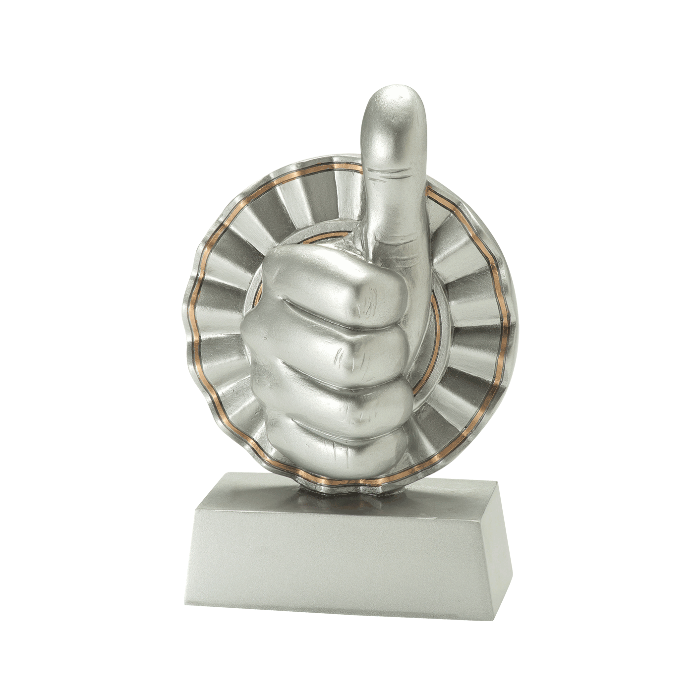 Heeft iemand iets goed gedaan? En wil je hem of haar een duim geven? Bestel dan deze duim trofee! Dit 3d beeld heeft Budgettrophy direct beschikbaar uit voorraad. De trofee laat een grote uitstekende duim zien en is daarmee geschikt voor ieder evenement of als presentje. Op de voet van de trofee kunt u een graveerplaatje laten toevoegen met uw eigen tekst. Budgettrophy monteert het graveerplaatje gratis voor u!