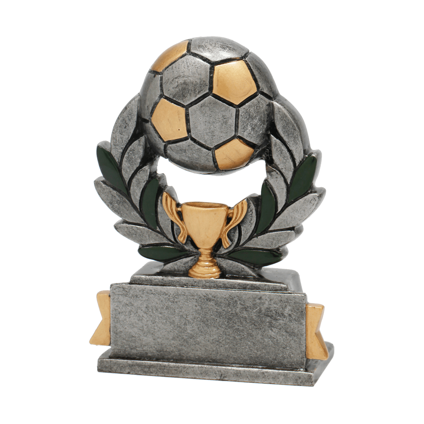 Deze oud-zilveren voetbal trofee heeft Budgettrophy direct beschikbaar uit voorraad. De trofee laat een voetbal zien met zilveren en gouden details. Op de voet van de trofee kunt u een graveerplaatje laten toevoegen met uw eigen tekst. Budgettrophy monteert het graveerplaatje gratis voor u!