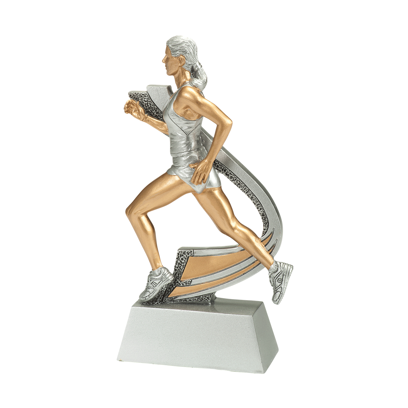 Dit hardloop beeld heeft Budgettrophy direct beschikbaar uit voorraad in 3 verschillende maten. De trofee is zilver en goud, en toont een hardloopster. Op de voet van de trofee kunt u een graveerplaatje laten toevoegen met uw eigen tekst. Budgettrophy monteert het graveerplaatje gratis voor u!