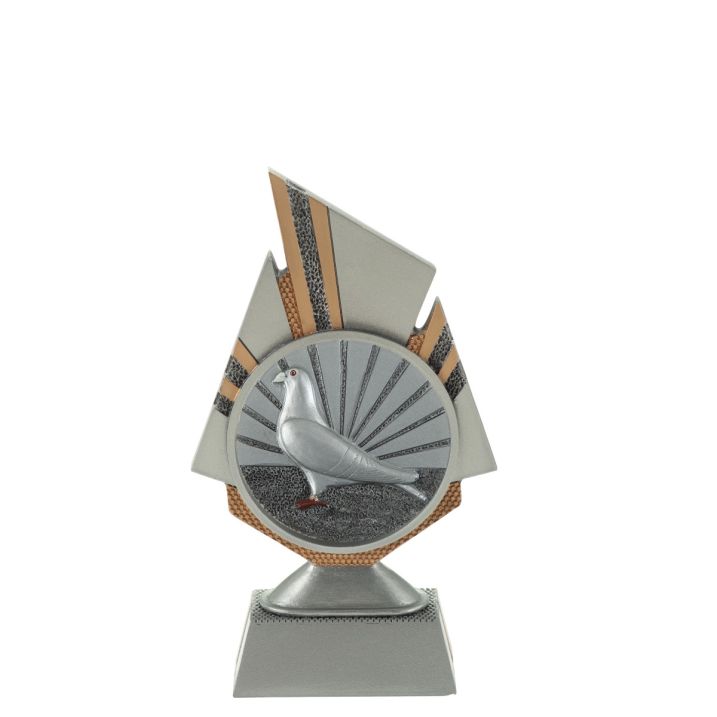 Deze trofee heeft Budgettrophy in 3 maten op voorraad. Het is een mooie resin houder, waar een duiven disc in bevestigd is. Onderaan de trofee is er plek voor een tekstplaatje waar je een eigen tekst op kan laten zetten. De montage van deze trofee wordt gratis uitgevoerd door Budgettrophy.