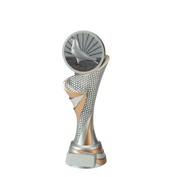Deze mooie, staande, trofee is beschikbaar in 3 verschillende maten. Het is een zilveren trofee met gouden details en bovenin zit een mooie duiven disc bevestigd. Op de onderkant van de trofee is ruimte voor een tekstplaatje met een eigen tekst. De montage van dit tekstplaatje wordt gratis gedaan door Budgettrophy!