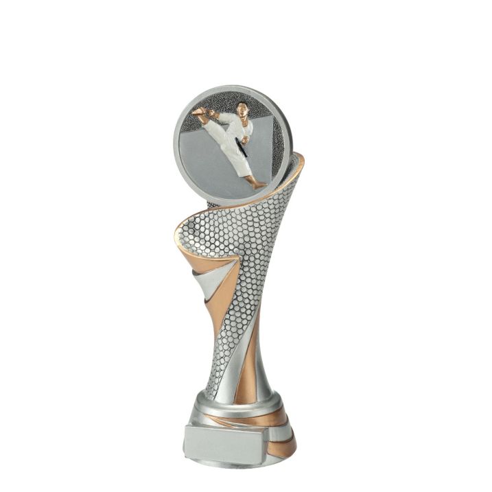 Deze mooie, staande, trofee is beschikbaar in 3 verschillende maten. Het is een zilveren trofee met gouden details en bovenin zit een mooie karate disc bevestigd. Op de onderkant van de trofee is ruimte voor een tekstplaatje met een eigen tekst. De montage van dit tekstplaatje wordt gratis gedaan door Budgettrophy!