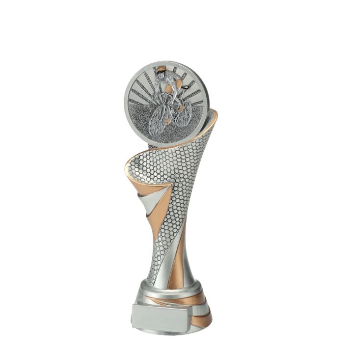 Deze mooie, staande, trofee is beschikbaar in 3 verschillende maten. Het is een zilveren trofee met gouden details en bovenin zit een mooie mountainbiken disc bevestigd. Op de onderkant van de trofee is ruimte voor een tekstplaatje met een eigen tekst. De montage van dit tekstplaatje wordt gratis gedaan door Budgettrophy!