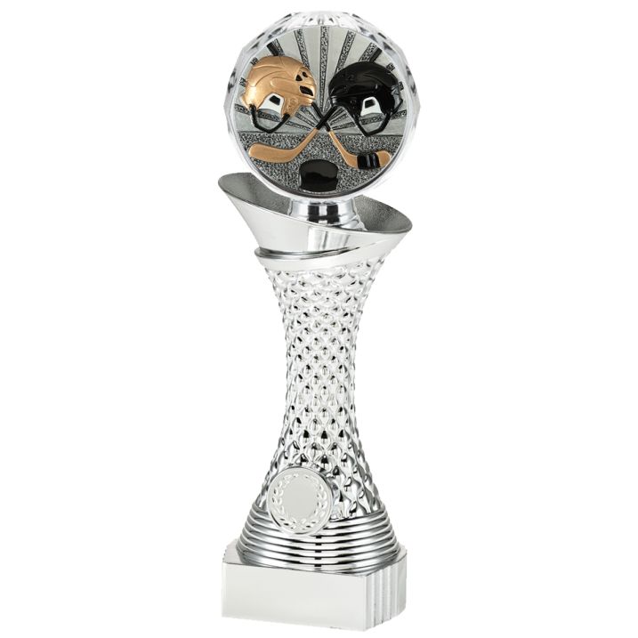 Deze zilveren trofee is in 3 maten beschikbaar bij Budgettrophy. Er zit een mooie ijshockey disc op de bovenkant van de trofee, en aan de onderkant is er ruimte voor een eigen afbeelding én een tekstplaatje! Voor de afbeelding kan je een eigen ontwerp uploaden. Of een van onze afbeeldingen kiezen. De montage van de trofee wordt gratis gedaan door Budgettrophy.