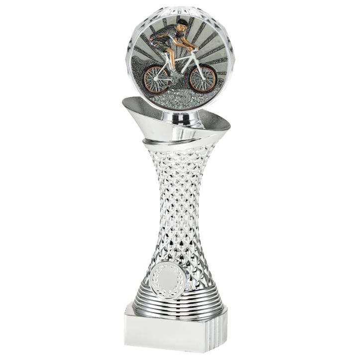 Deze zilveren trofee is in 3 maten beschikbaar bij Budgettrophy. Er zit een mooie mountainbike disc op de bovenkant van de trofee, en aan de onderkant is er ruimte voor een eigen afbeelding én een tekstplaatje! Voor de afbeelding kan je een eigen ontwerp uploaden. Of een van onze afbeeldingen kiezen. De montage van de trofee wordt gratis gedaan door Budgettrophy.