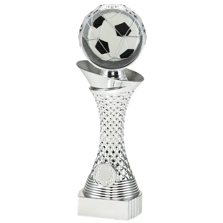Deze zilveren trofee is in 3 maten beschikbaar bij Budgettrophy. Er zit een mooie voetbal disc op de bovenkant van de trofee, en aan de onderkant is er ruimte voor een eigen afbeelding én een tekstplaatje! Voor de afbeelding kan je een eigen ontwerp uploaden. Of een van onze afbeeldingen kiezen. De montage van de trofee wordt gratis gedaan door Budgettrophy.