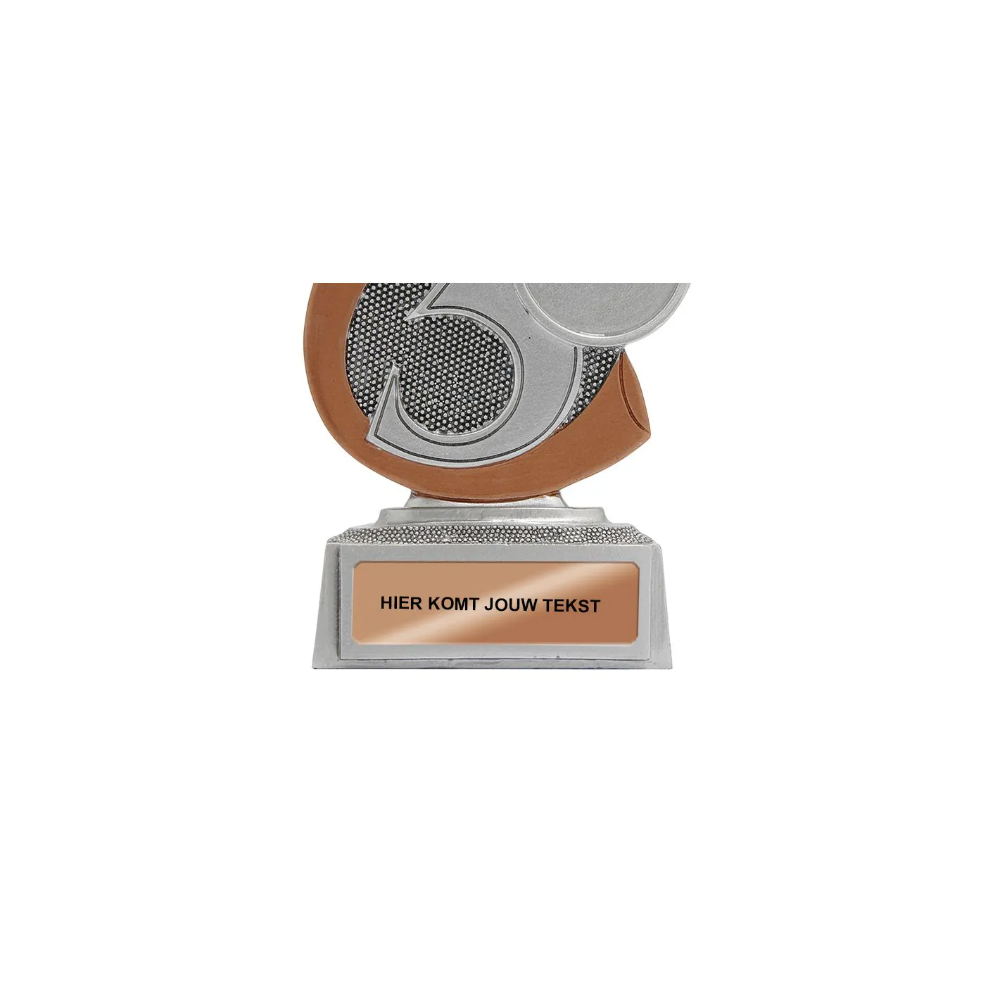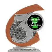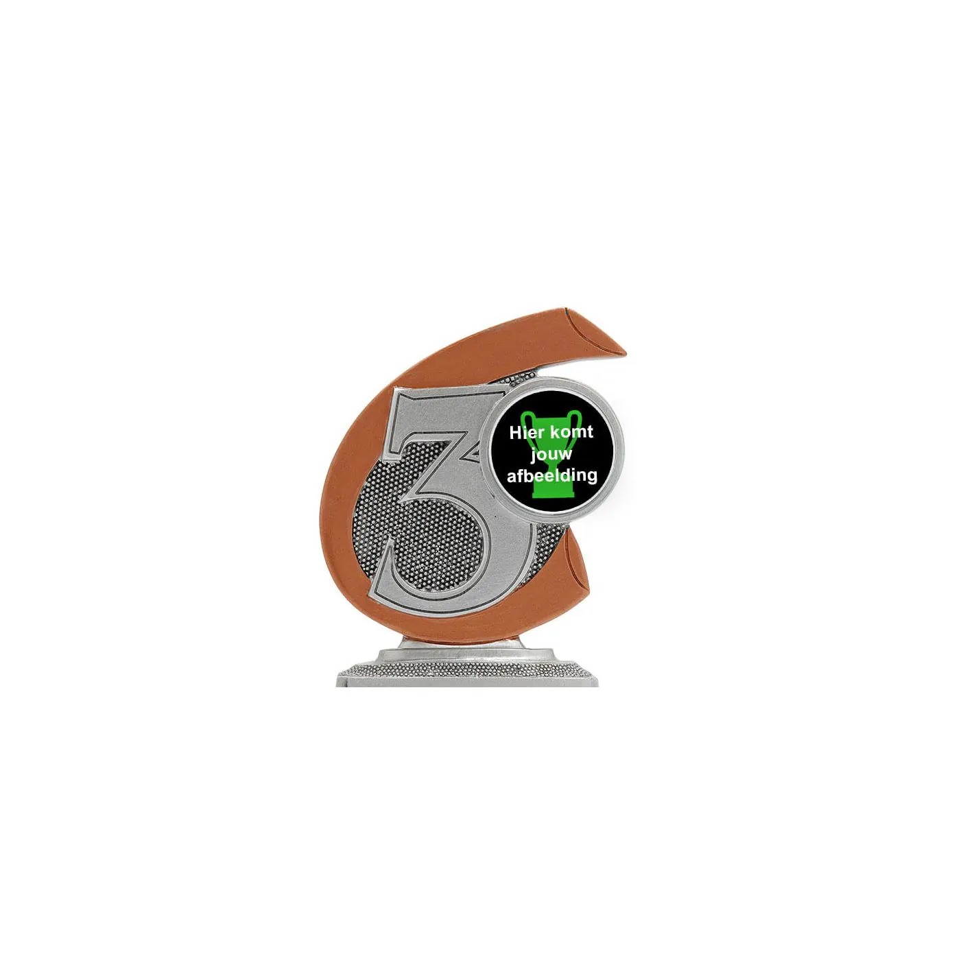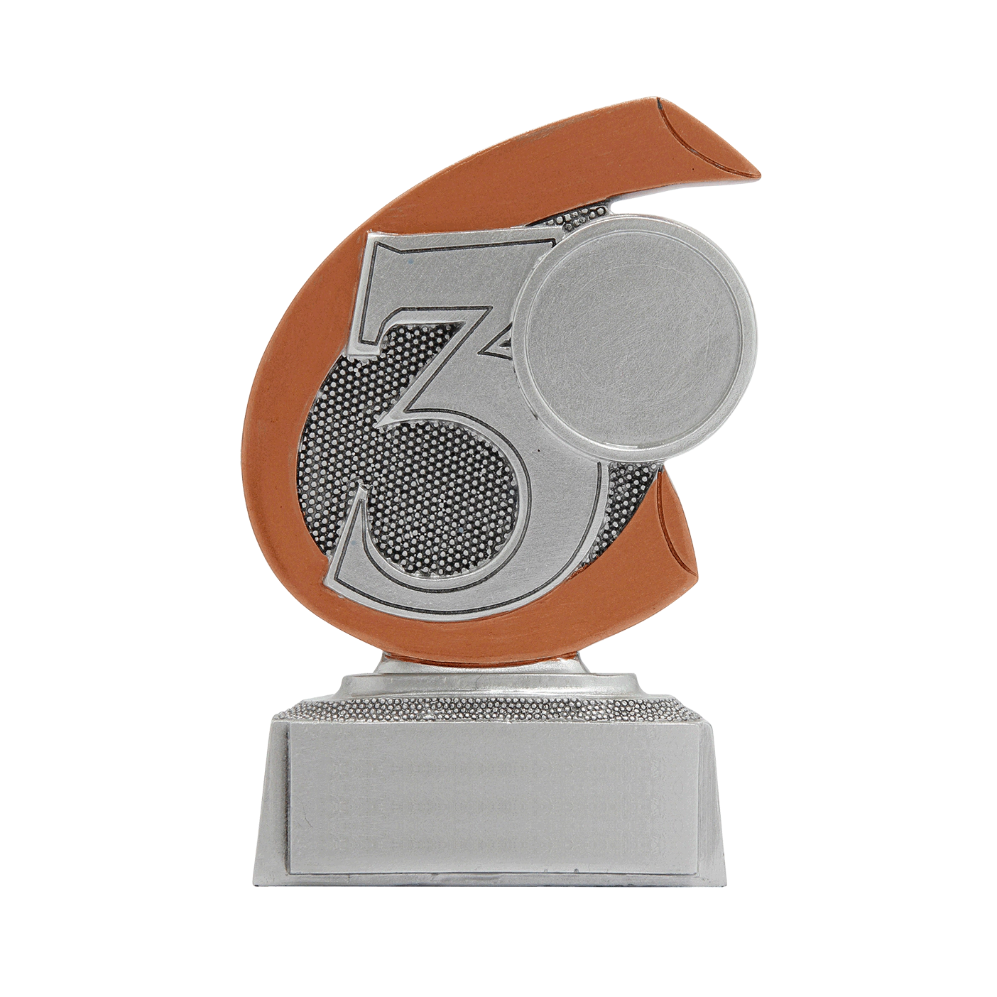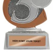 Deze resin voor de nr.3 is oud zilver met bronzen details en heeft Budgettrophy direct beschikbaar uit voorraad. De trofee kunt u sport specifiek maken door een (sport)afbeelding naast de “3” toe te voegen. Budgettrophy heeft een ruim assortiment aan (sport)afbeeldingen waar u uit kunt kiezen. Op de voet van de trofee kunt u daarnaast een graveerplaatje laten toevoegen met uw eigen tekst. Budgettrophy monteert de afbeelding en het graveerplaatje gratis voor u!