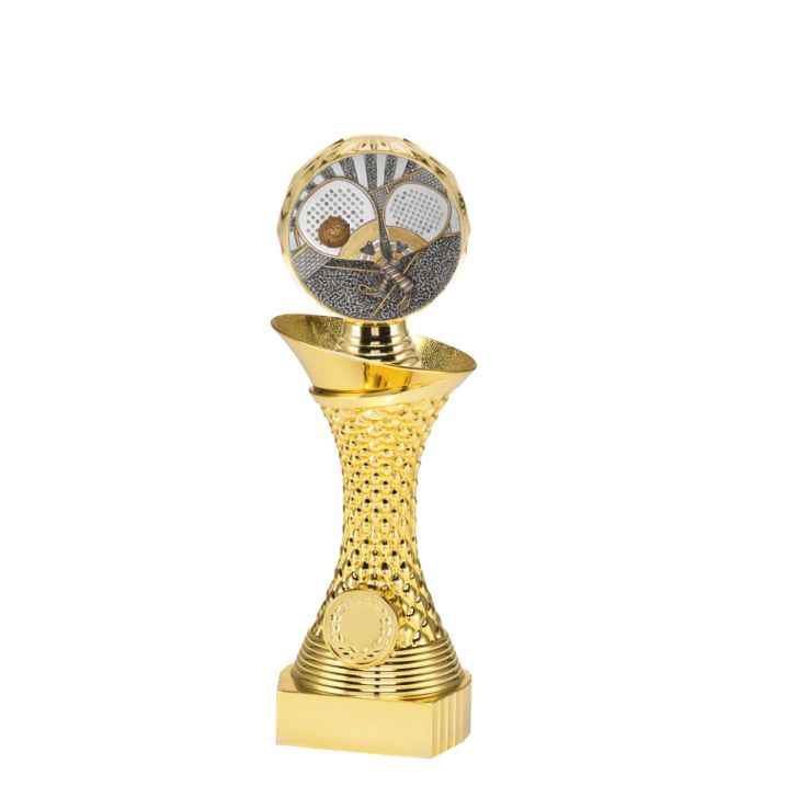 Deze gouden trofee is in 3 maten beschikbaar bij Budgettrophy. Er zit een mooie padel disc op de bovenkant van de trofee, en aan de onderkant is er ruimte voor een eigen afbeelding én een tekstplaatje! Voor de afbeelding kan je een eigen ontwerp uploaden. Of een van onze afbeeldingen kiezen. De montage van de trofee wordt gratis gedaan door Budgettrophy.