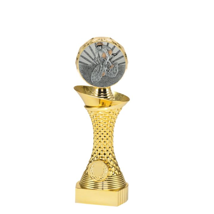 Deze gouden trofee is in 3 maten beschikbaar bij Budgettrophy. Er zit een mooie wielren disc op de bovenkant van de trofee, en aan de onderkant is er ruimte voor een eigen afbeelding én een tekstplaatje! Voor de afbeelding kan je een eigen ontwerp uploaden. Of een van onze afbeeldingen kiezen. De montage van de trofee wordt gratis gedaan door Budgettrophy.