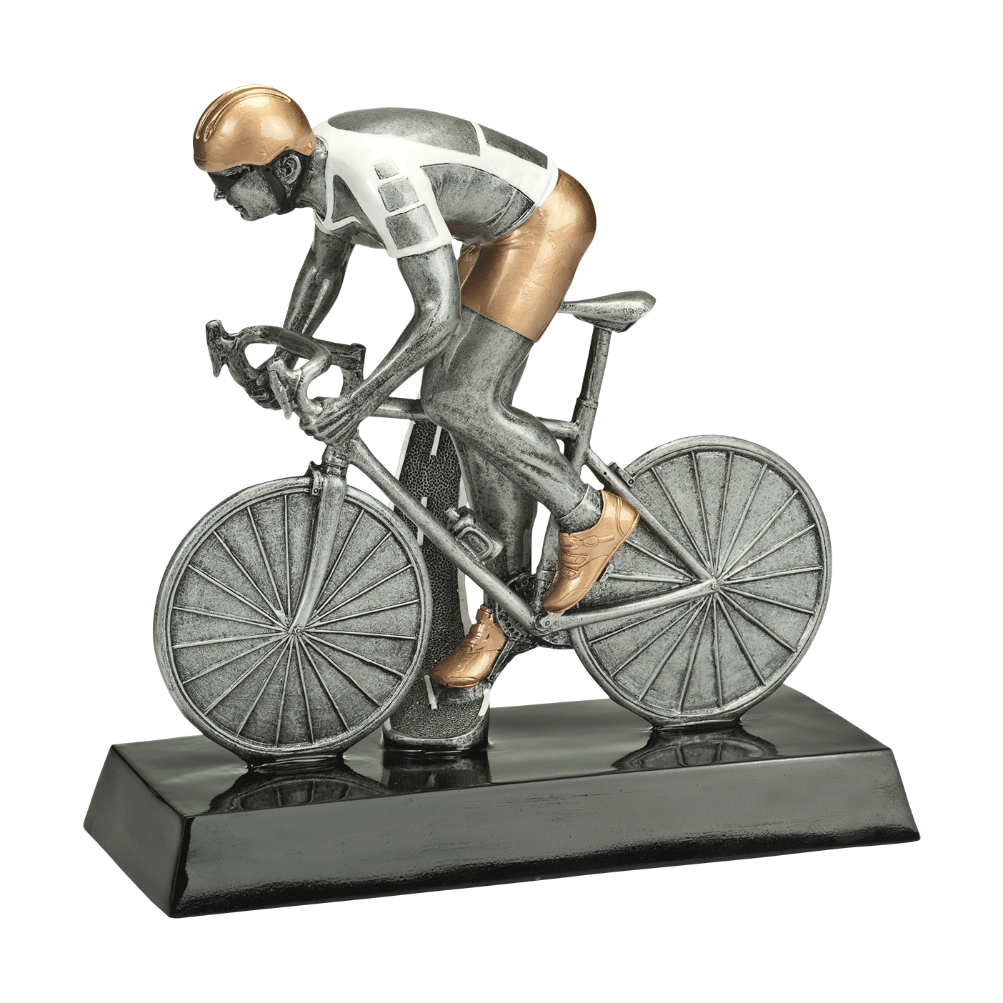 Deze zilveren resin met gouden details voor wielrennen heeft Budgettrophy direct beschikbaar uit voorraad in 3 verschillende maten. De trofee is voorzien van een man die op een wielrenfiets zit. Op de voet van de trofee kunt u een graveerplaatje laten toevoegen met uw eigen tekst. Budgettrophy monteert het graveerplaatje gratis voor u!