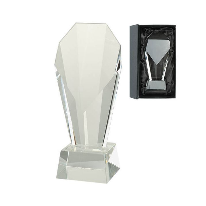 Deze glazen standaard is zeer stevig en heeft verscheidene diamanthoeken. De bovenkant is schuin afgevlakt, en hier kunt u het glas laten laseren naar wens. Upload uw eigen afbeelding, logo en/of tekst en Budgettrophy zal binnen 24uur na de orderbevestiging, een proefdruk toesturen voor uw akkoord
